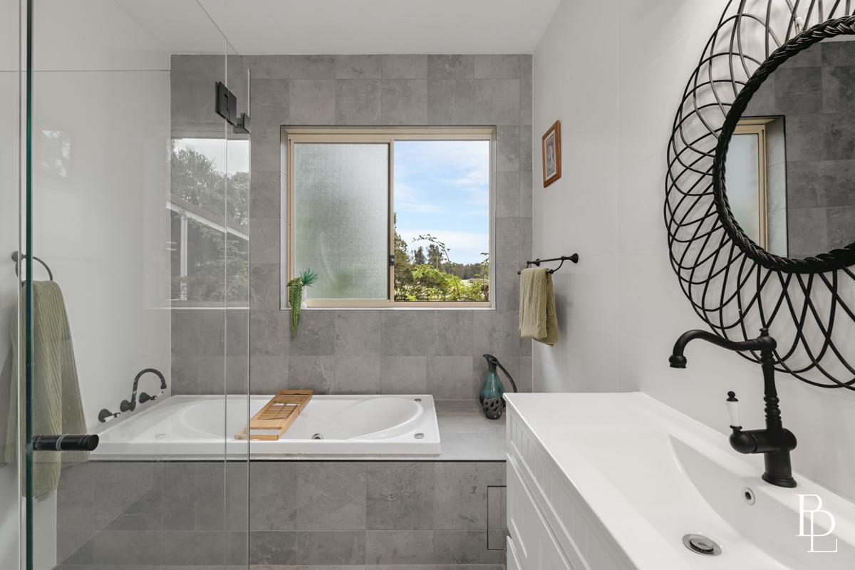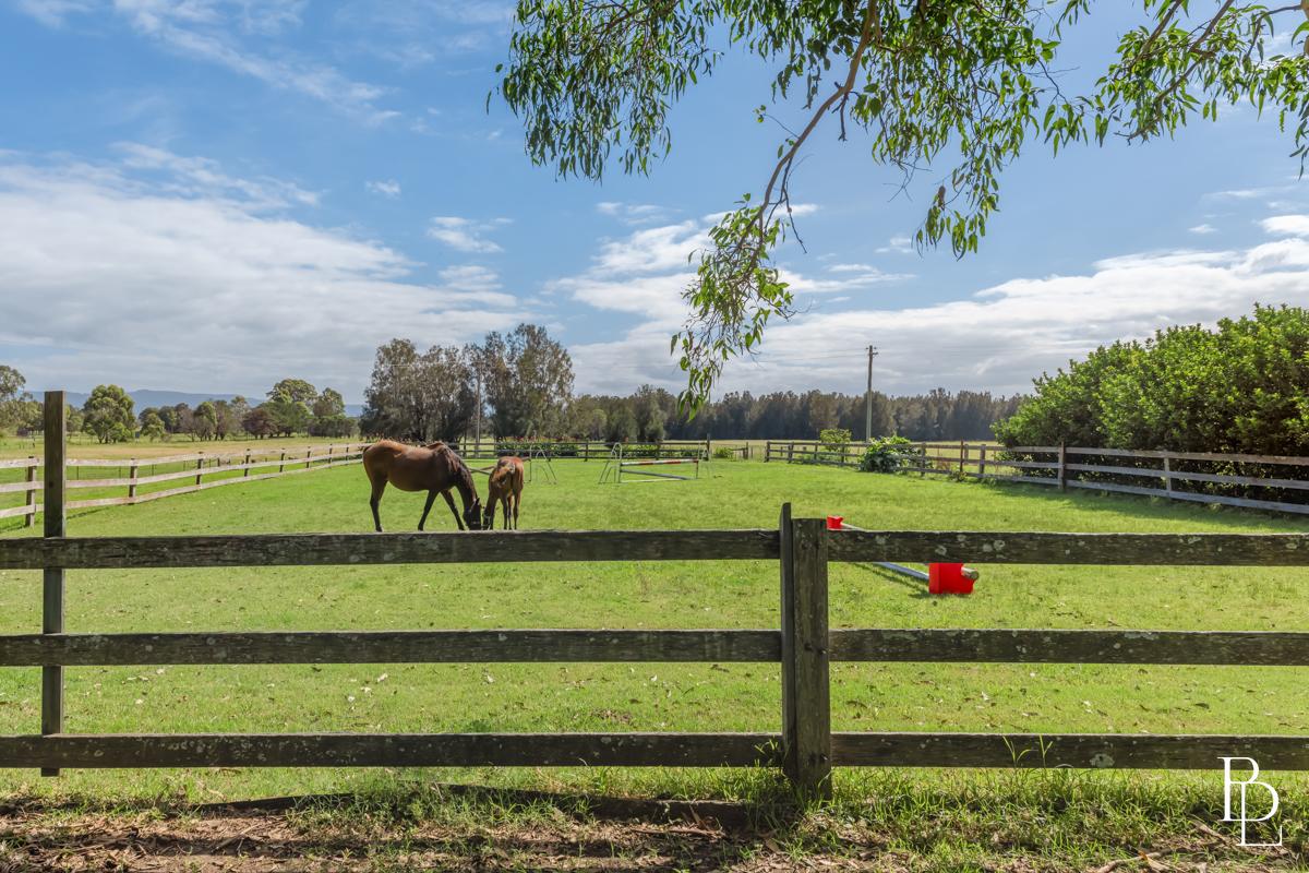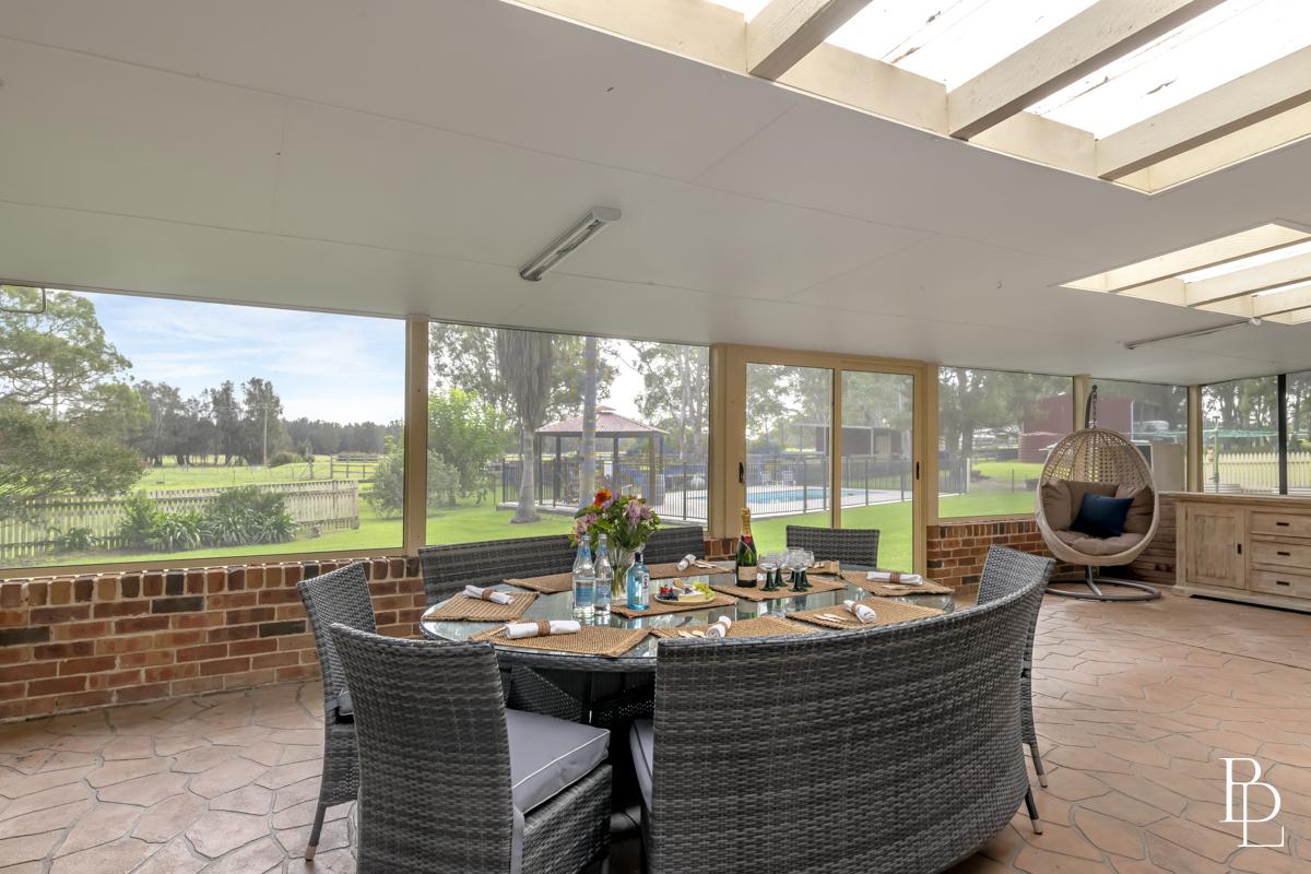 Step outside and the serenity is next level. An enclosed outdoor entertaining area overlooks the inground pool and lush horse paddocks – the ideal vantage point for watching children play, horses graze or the sky blush at sunset. Fruit lovers, there’s a prolific mulberry tree, a pear tree and fully established lemon and apple trees, so you can pick your own produce through the seasons. Native birdsong is a constant soundtrack.